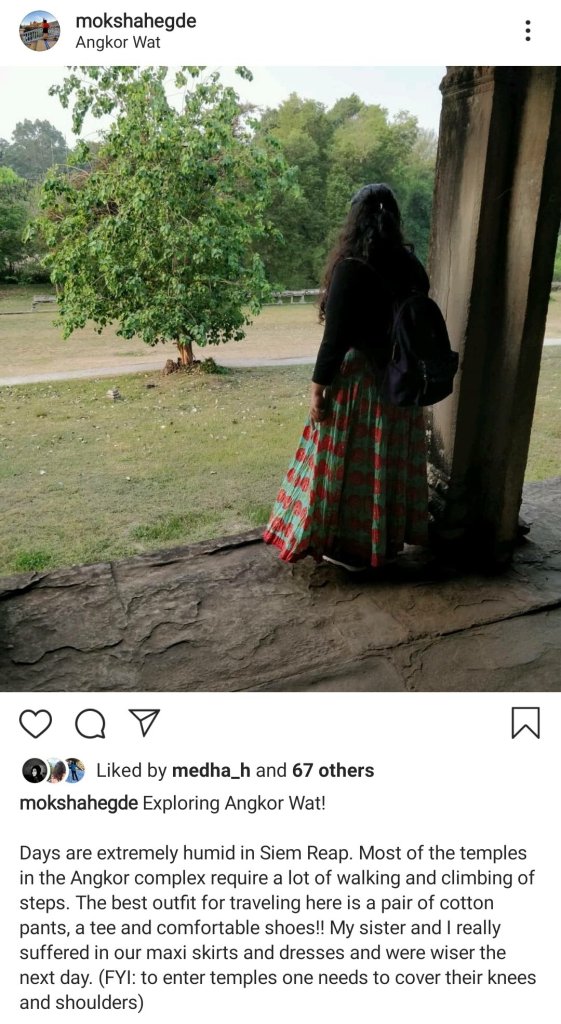 I thought I’ll start the travel series with a blog combining two of my favourite topics travel and fashion! For the longest time, while travelling my outfit preference used to be anything comfortable. Comfortable for me means – sports/walking shoes + shorts/leggings/cotton pants + weather appropriate top wear. But more recently, I’ve started enjoying photographing myself in all these beautiful places I visit. I realised that outfits play a role in adding that extra wow to your travel photos and started experimenting with my travel outfits. In the beginning it was a little disastrous. I wore a maxi skirt to explore the temples of Angkor (Cambodia) in 35degree humid weather. Add to it the crazy number of steps we had to climb and the crazy amount of kms we had to walk – I legit hated myself that day.