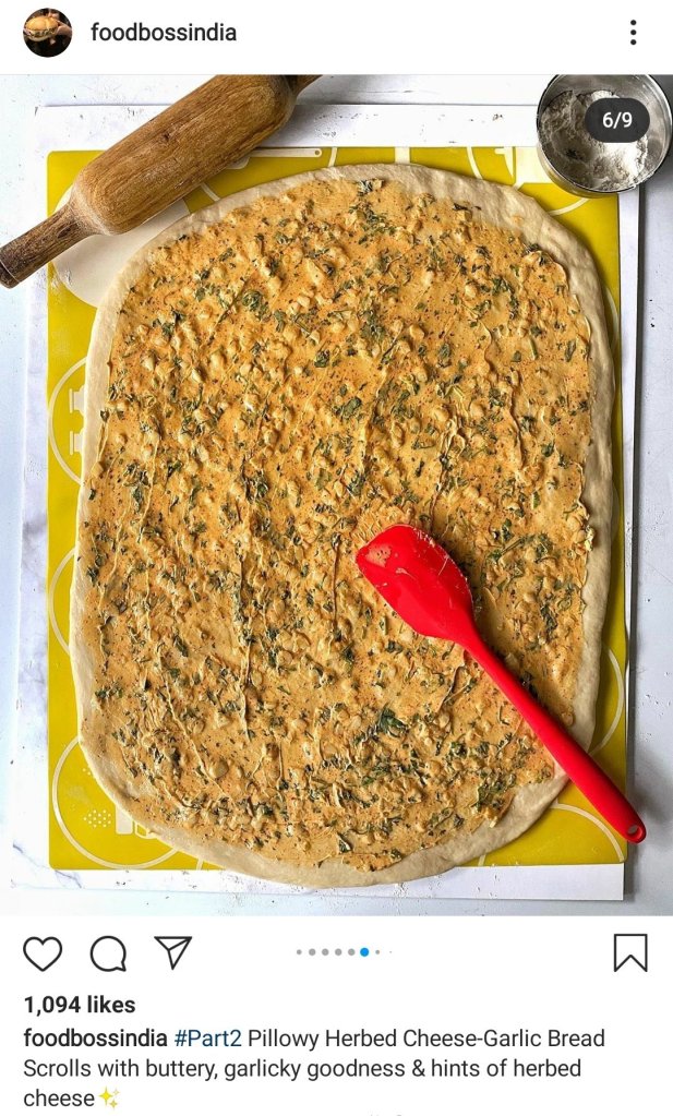 • After you’ve gotten the dough in a shape that you’re happy with, spread the toppings of your choice on it. I did a thick layer of butter followed by finely chopped garlic and grated cheese. You can make it a pizza roll and go with pizza toppings or make it a dessert roll with Nutella and choco chips.
