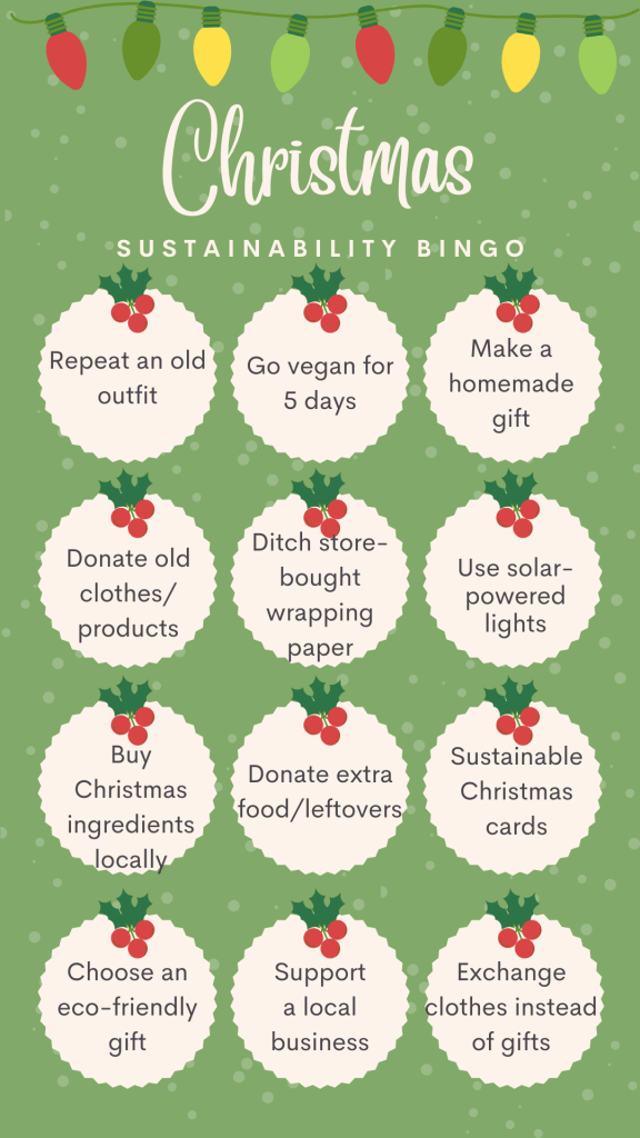 Tia and I are back with our last sustainability challenge for the year. It is that time of the year – when fun & festivities are in the air. While a huge part of the world is busy with Christmas celebrations, additionally in India – it is the wedding season! I’ve spent the last few days wedding hopping and boy, is that exhausting. Tia and I were discussing our final sustainability challenge for 2021 (we’ve done a few together this year) and decided to make it a challenge everyone can par take in. The challenge is ’12 days of sustainability’ which borrows from ’12 days of Christmas’. Tia proposed the idea of having 12 sustainability related festive challenges that can be done across this month. We tweaked the idea to make it a fun game of BINGO. Below are the challenges divided into 4 rows. The goal is to do any 3 in a row which gives you BINGO! We hope you’ll join us on this challenge and par take in our effort to be more sustainable. The goals are related to Christmas, New Year’s and weddings to have an array of choices for you to choose from.