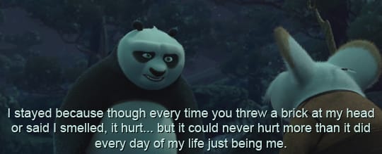 Po “accidently” gets picked as the dragon warrior and it is all that he is ever wanted. But Master Shifu and the others pick on him in the hopes that he will leave. This scene gets me every single time – I spent most of my 20s relating to this feeling.