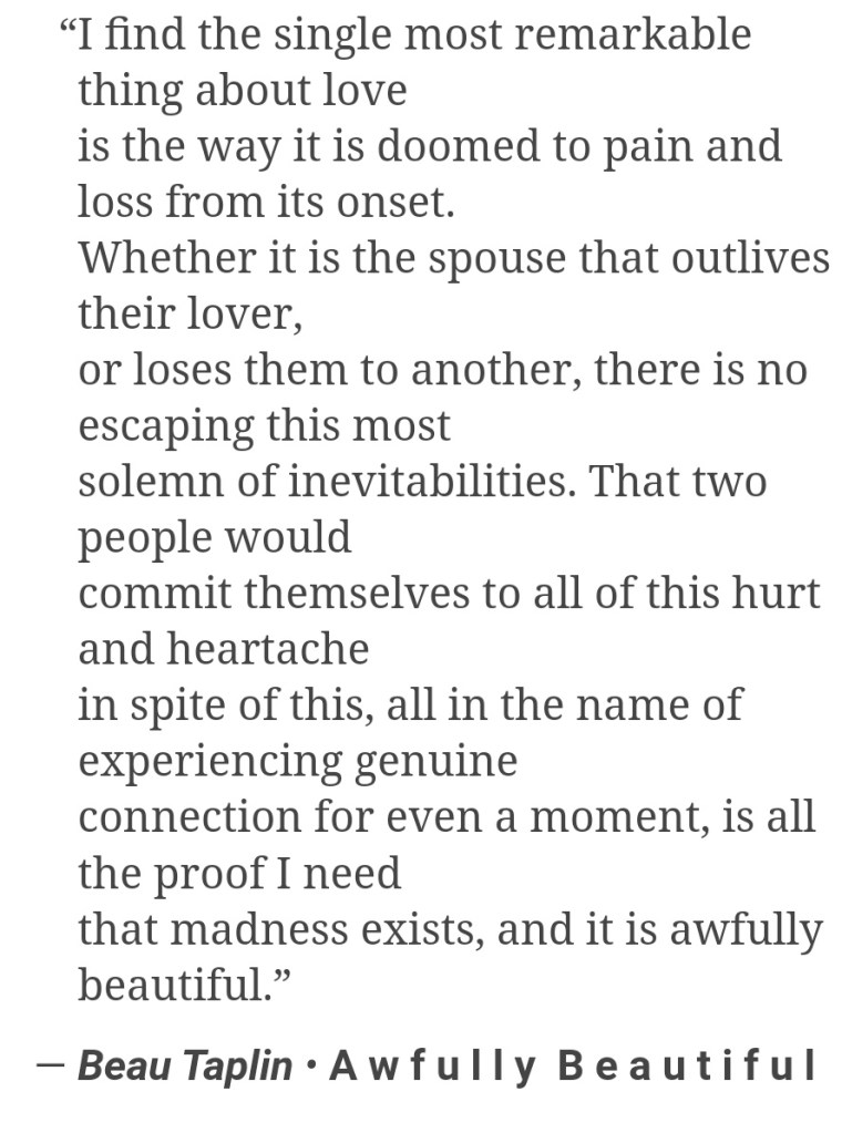 These beautiful words by Beau Taplin explain my fears exactly. I’ve lost love before and just barely managed to pull it along after. The idea of finding someone I love more than anything and eventually losing them really scares me a lot. Losing them to death or to life is just a very scary thought. I’d rather be alone than feel that kind of pain. I can’t imagine coping with that kind of loss again.