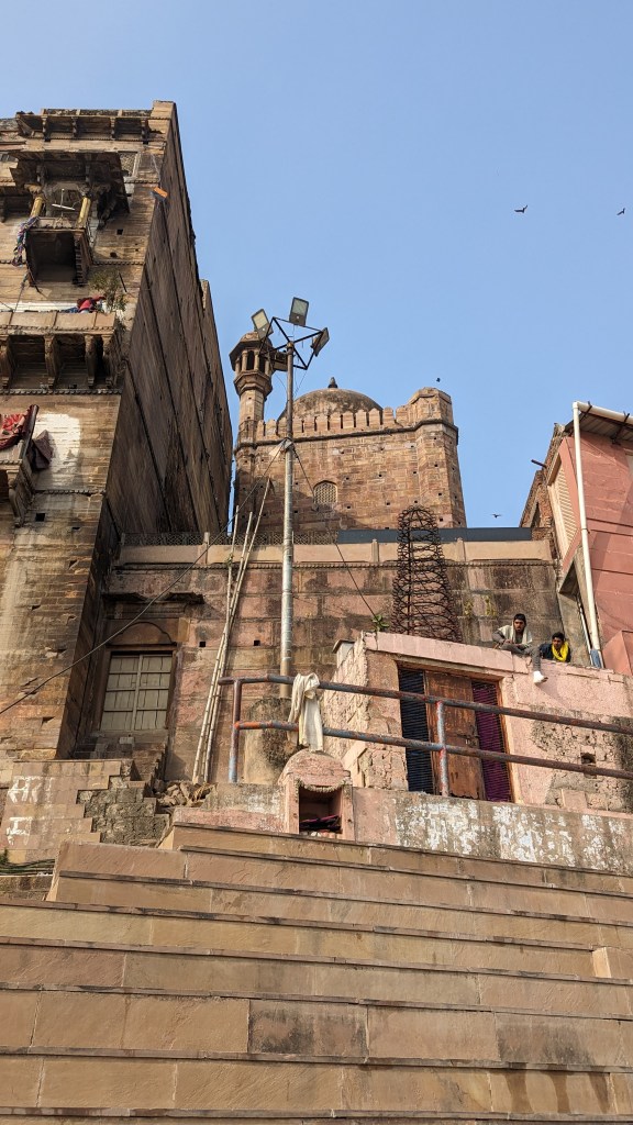 While we were standing in the queue we got a glimpse of the Gyanvyapi Masjid (mosque) on the side of the temple and the Masjid’s architecture caught our attention. This masjid was the original temple that Mughal emperor Aurangzeb demolished to build a mosque on. The architecture of the building is unique because you can see the Hindu temple influence and where the Islamic architecture has been added on. We really wanted to get a closer look but due to increased security, we weren’t allowed to go near it. So we decided to head to the other Mosque Aurangzeb had built in Varanasi i.e. Alamgir Mosque. The Alamgir Mosque is situated on the banks of Ganga on the Panchaganga Ghat. With a lot of difficulty and navigating through the streets of Varanasi we found ourselves on the ghat outside the Mosque. We couldn’t figure out how to get to the Mosque so we marvelled at it from outside.