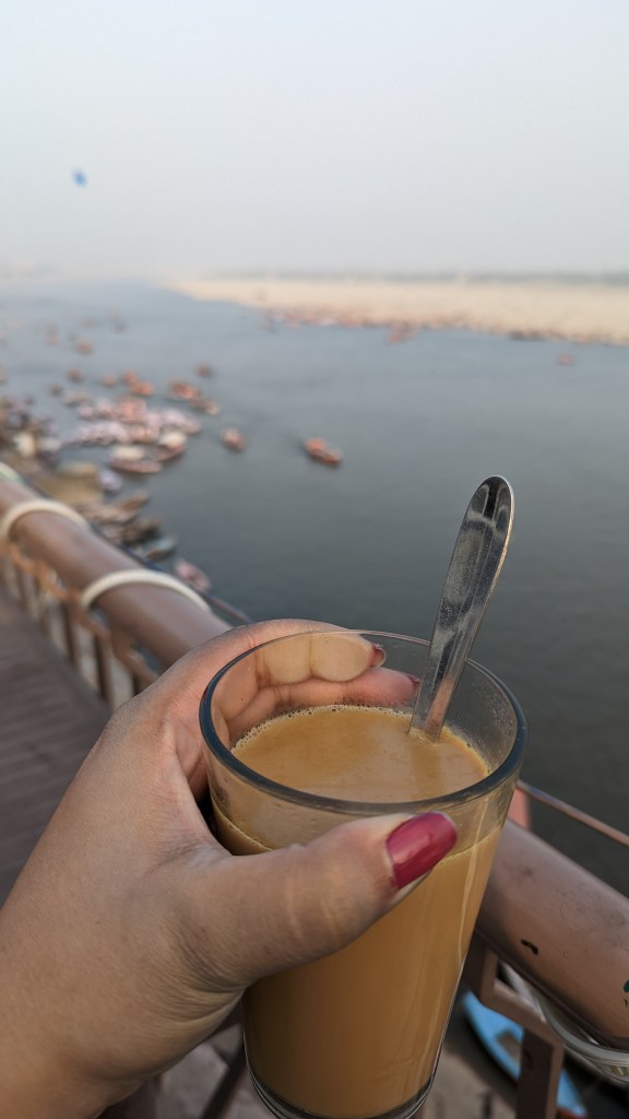 We then found a quiet spot on a ghat to sit down and just enjoy being there. Since we were away from the more popular ghats, this ghat was quiet and peaceful. We then walked along the ghats trying to still find a way to get closer to the Gyanvyapi Masjid. As we reached Manikarnika Ghat, my friend and I were filled with dread, watching dead bodies burning at close quarters is harrowing and was a first for me. We avoided the ghat the best we could and started walking the ghats towards a rooftop hotel with the best view of the river Ganga. The ghats were crowded and there was a lot going on. We had chai and snacks at Ganga View Cafe at Chausatti Ghat and the view was incredible.