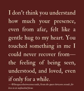 I hope that in quiet hours, when the world feels heavy, you remember there was someone who looked at you and saw something worth holding on to. (line copied from an IG post)